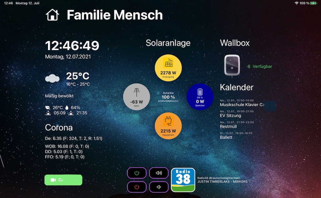 Anbei ein Bild meines iOS-iPad-Dashboard, u.a. für den Status meiner SENEC-Solaranlage. Das Dashboard sendet den Solaranlagen-Status auch alle 10 Sekunden hierher! Letzter Messwert: