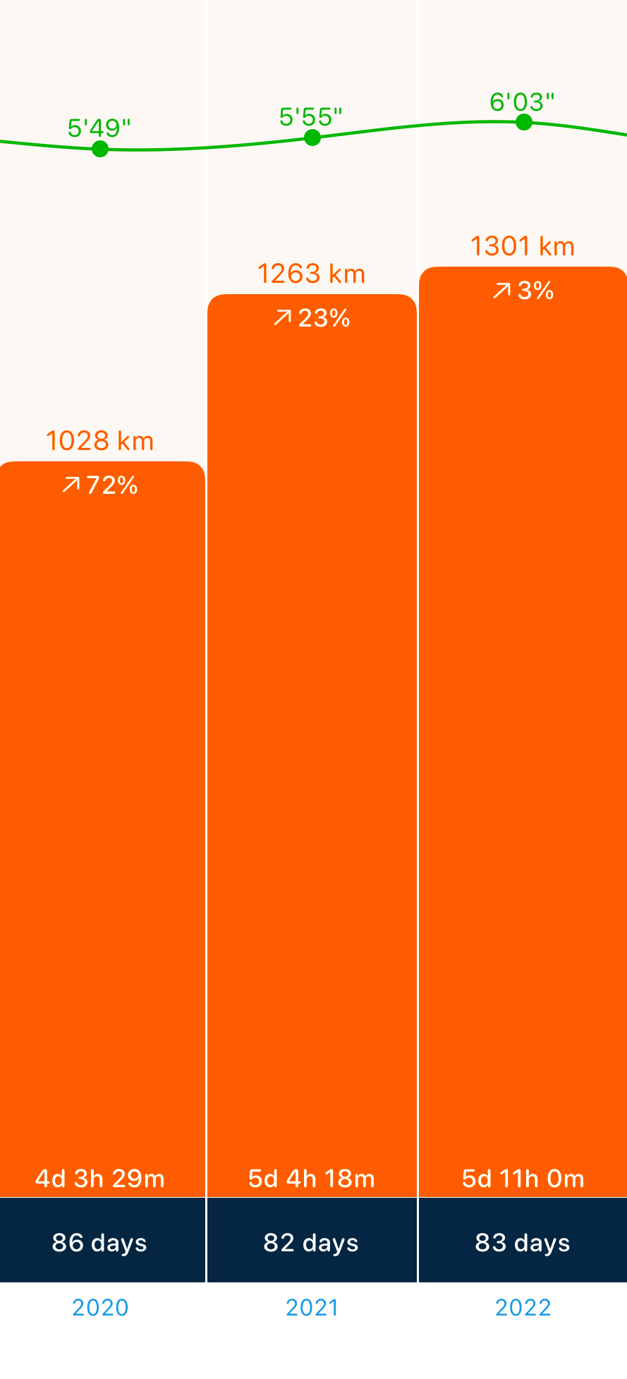 Summe: 1263 km, Pace: 5:55, Trainings: 82