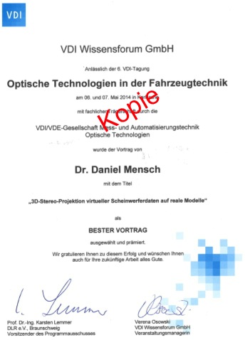 | 12/2007 - 05/2012 | Promotion: "Untersuchungen zur Bewertung der Gleichmäßigkeit von Kfz-Signallichtfunktionen" (Kurzfassung, Inhaltsverzeichnis, Doktorarbeit), Volkswagen AG, Aufbau-Entwicklung, Licht und Sicht, Note: magna cum laude | |